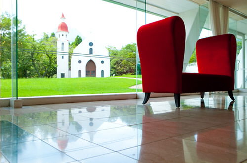 館内に入ると、そこは日常から解放され、時がゆったりと流れる、リゾート気分を満喫できる空間が広がります。シャンデリアが美しいロビー、広々とした受付でお出迎え。談笑や小休憩にもご利用頂けます。